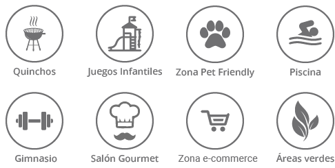 El edificio cuenta con un salón lounge full equipado a pasos de la piscina, quincho y juegos infantiles, conectados a áreas verdes.